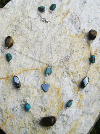 Each Tiger's Eye, Turquoise, and Hematite stone is hand-wire-wrapped and joined together with Sterling Silver chain to form a necklace that provides the wearer with grounding and protective healing energies. Two hand-wrapped Turquoise stones adorn the Sterling Silver clasp. Neckline: 16" or 18".