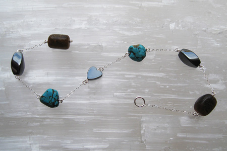 This powerful Strand features a hematite heart, nestled between turquoise, hematite, and tiger's eye stones, two each. Hand-wire-wrapped stones, sterling silver chain. Length: 11".