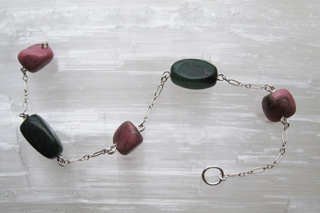 Three rhodonite stones and two green aventurine stones are connected with Sterling Silver chain to form this gently powerful Strand. All stones hand-wire-wrapped. Length: 7-3/4".